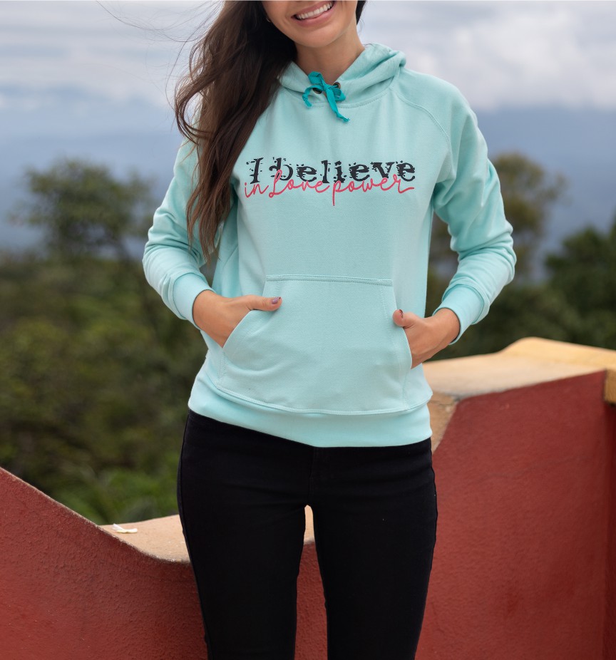Moletom Feminino manga longa com capuz e bolso canguru.